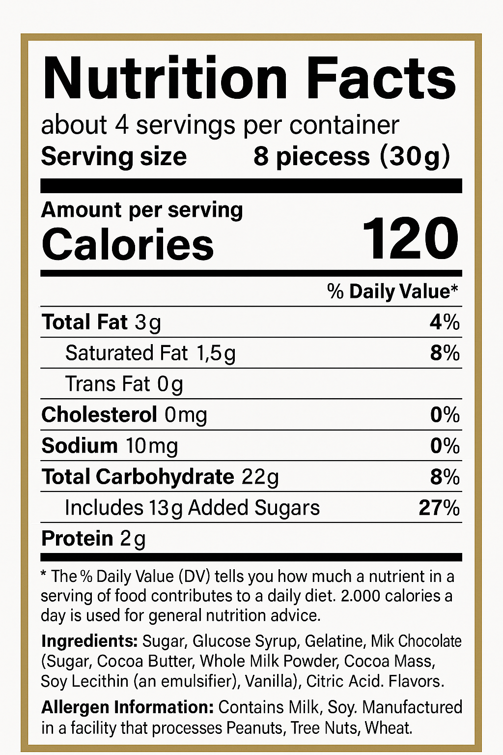 Ingredients: Milk Chocolate (Sugar, Cocoa Butter, Chocolate Liquor, Whole Milk Powder, Soy Lecithin, Vanilla), Gummy Bears (Glucose Syrup, Sugar, Gelatin, Citric Acid, Fruit & Vegetable Juice [for color], Natural & Artificial Flavors).
